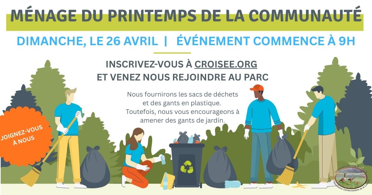 Joignez-vous à nous pour le ménage du printemps de la communauté le dimanche 26 avril à 9 h. C’est une belle occasion de se rassembler, profiter du plein air et contribuer à garder notre quartier propre et accueillant.